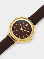 This stylish watch features a Gold Plated round case, sleek brown dial and brown genuine leather strap.