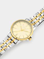 This stylish watch features a Gold Plated round case, champagne dial and Gold Plated two-tone bracelet strap.
