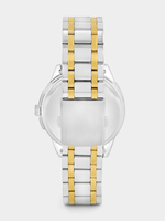 This stylish watch features a Gold Plated round case, green and gold toned multi-fashion dial and two-tone bracelet strap.