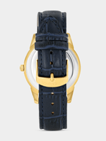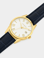 This stylish watch features a Gold Plated round case, silver toned dial with a date window and blue genuine leather strap.