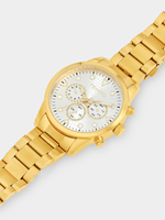 This stylish Gold Plated bracelet watch features a round case and textured silver toned fashion chrono dial.