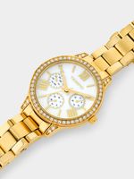 This glamorous Crystal-embellished Gold Plated bracelet watch features a round case and white Mother Of Pearl multi-fashion dial.
