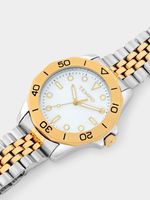 This diver-style watch features a Gold Plated round case, brushed top ring, white Mother Of Pearl dial and Gold Plated two-tone bracelet strap.