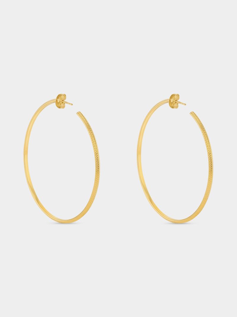 These stylish 52mm textured skinny hoop earrings are expertly crafted in Gold Plated Stainless Steel. They’re waterproof, anti-tarnish and boast a 1-year guarantee.