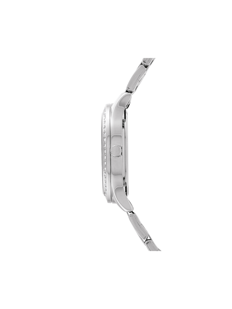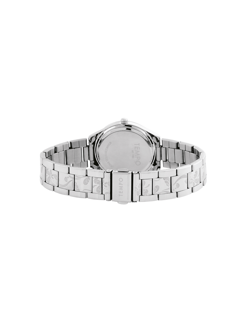 This feminine Tempo ladies Silver-toned watch features a round 35mm case, a dial set to sparkle with eye-catching Crystals and a matching bracelet strap.