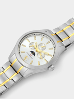 Crafted in Titanium, this sophisticated timepiece features a round case, sleek gunmetal toned multifunction dial with an eye-catching sun and moon sub-dial, and a bracelet strap enhanced by Gold Plated polished accents. While exceptionally strong and durable, Titanium is also celebrated for being lightweight and hypoallergenic, making it as comfortable as it is resilient.