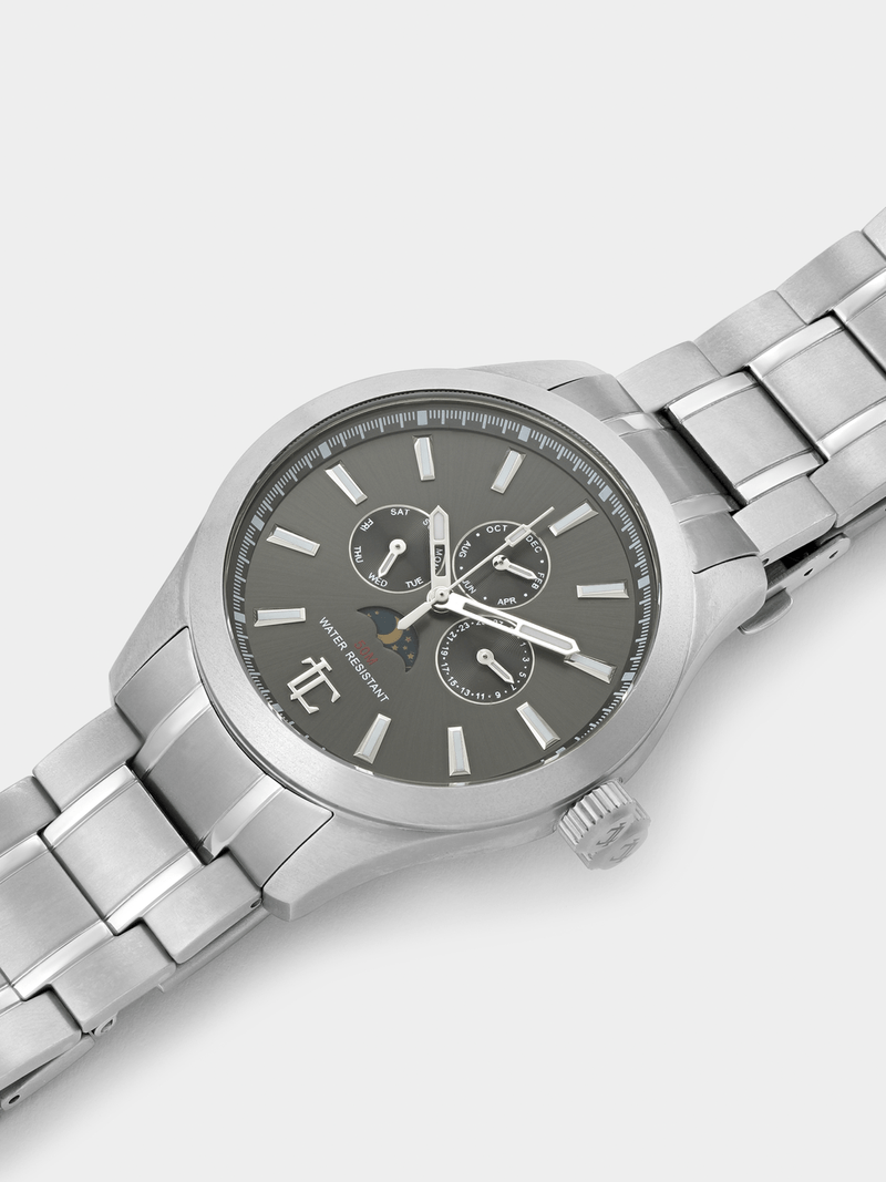 Crafted in Titanium, this sophisticated timepiece features a round case, sleek gunmetal toned multifunction dial with an eye-catching sun and moon sub-dial, and a bracelet strap enhanced by polished accents. While exceptionally strong and durable, Titanium is also celebrated for being lightweight and hypoallergenic, making it as comfortable as it is resilient.