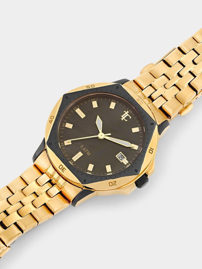 This stylish fully Stainless Steel diver bracelet watch features a two-tone Gold and Black Plated round case and black Mother Of Pearl dial with Japanese Quartz movement. Special features include a calendar function, 50 metre water resistance and a 5-year guarantee.