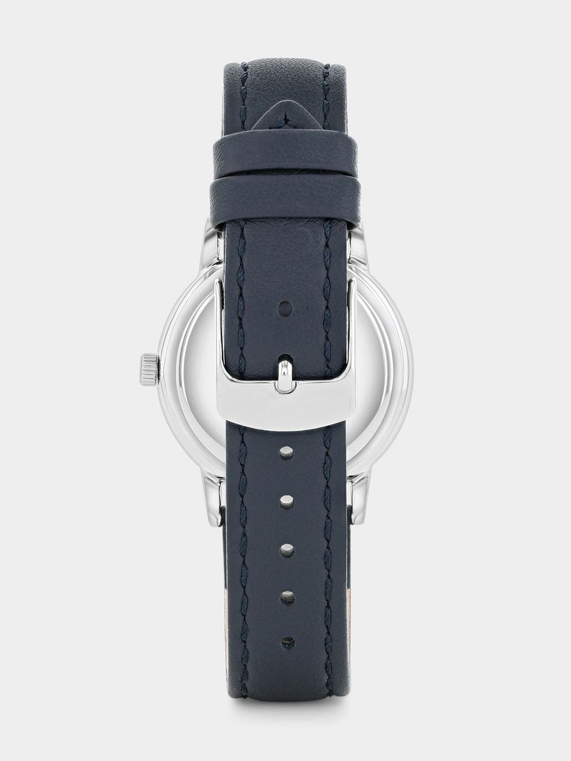 This stylish fully Stainless Steel watch features a Silver Plated round case, sleek navy dial with Japanese Quartz movement, a domed mineral glass and navy genuine leather strap. Special features include 30 metre water resistance and a 5-year guarantee.