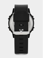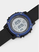 This sporty digital watch features a black round case, blue top ring and sturdy black resin strap.