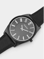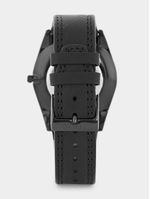 This stylish men’s watch features a Black Plated round case, sleek black dial and black genuine leather strap.