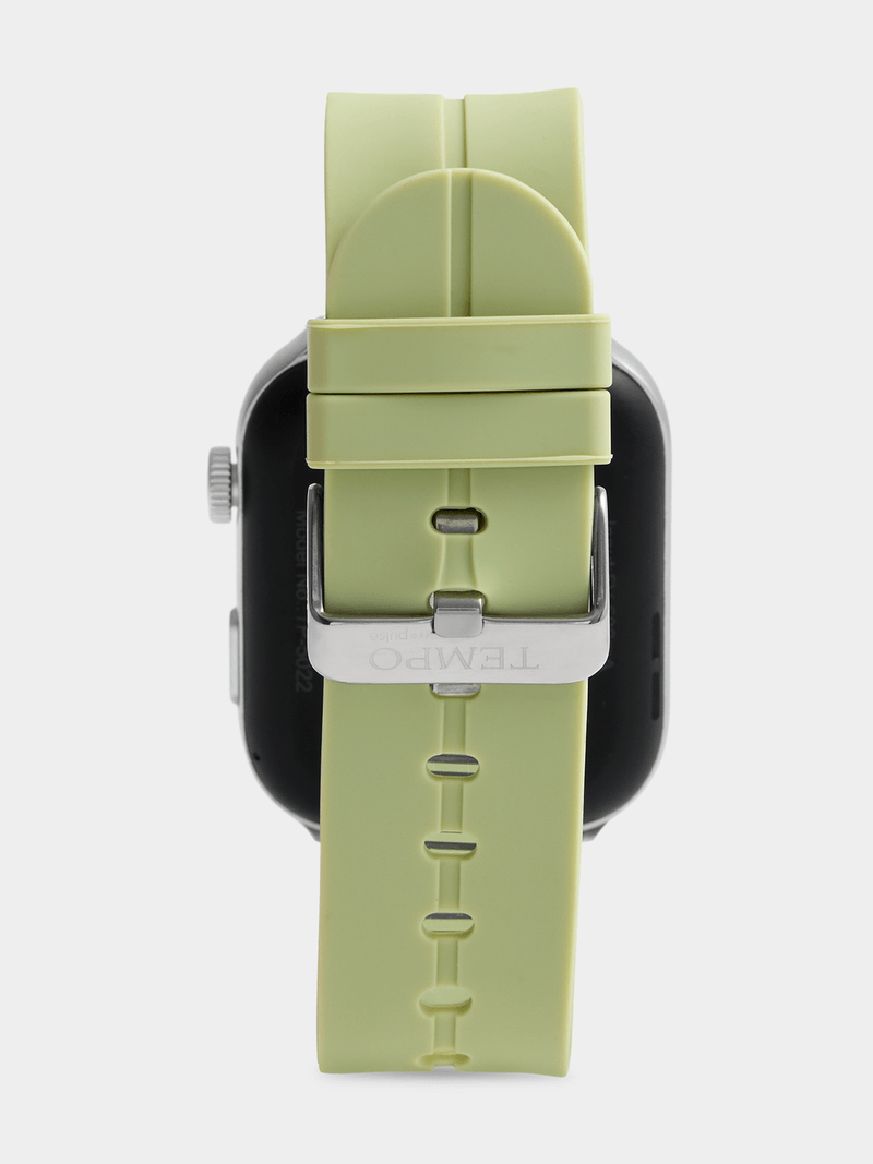 Monitor your fitness while enhancing your daily life with this splash-resistant smart watch featuring a Silver Plated square case, AMOLED touch display and durable, hypoallergenic mint silicone strap. Special features include a pedometer, heart rate monitor, blood oxygen measurer, sleep tracking, multisport modes, Bluetooth calling, missed call and message notification, plus up to 5 days of battery life.