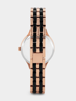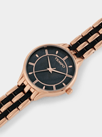 This stylish watch features a Rose Plated round case, black Mother Of Pearl dial and black acetate enhanced bracelet strap.