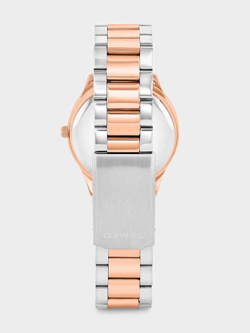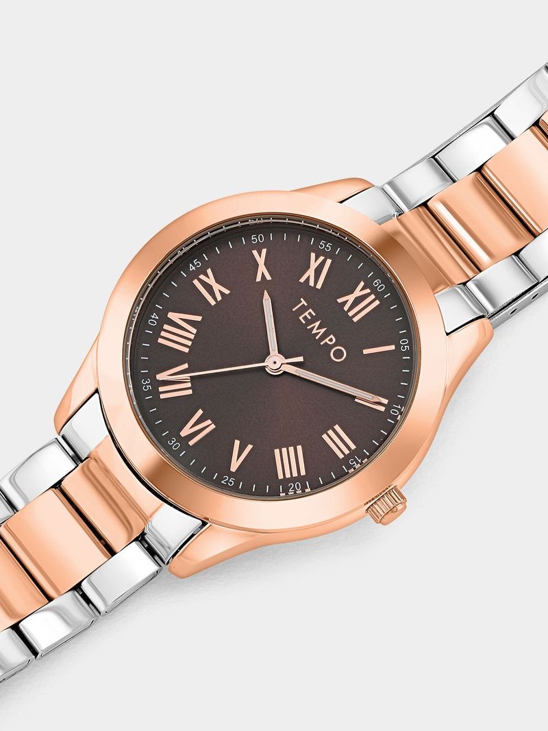 This stylish watch features a Rose Plated round case, sleek brown dial and two-tone bracelet strap.