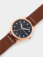 This stylish watch features a Rose Plated round case, navy blue multi-fashion dial with a date window and brown genuine leather strap.