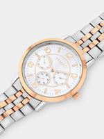 This stylish watch features a Rose Plated round case, silver toned multi-fashion dial and Rose Plated two-tone bracelet strap.