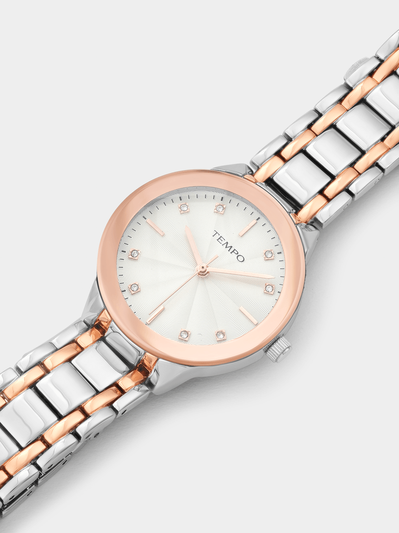 This elegant watch features a Rose Plated round case, silver toned dial and Rose Plated two-tone bracelet strap.