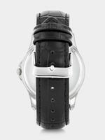 This vintage-style watch features a Silver Plated round case with a Black Plated top ring, black multi-fashion dial and black genuine leather strap.