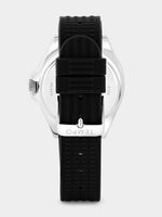 This stylish watch features a Silver Plated round case with a Black Plated top ring, black dial and black silicone strap.