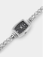 This stylish set features a Silver Plated bangle watch with a tonneau-shaped case and sleek black dial paired with a matching bracelet.