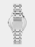 This stylish Silver Plated bracelet watch features a round case with a wheel-inspired black multi-fashion dial.