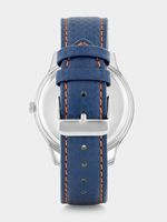 This stylish watch features a Silver Plated round case, textured blue multi-fashion dial and blue genuine leather strap with orange stitching and a carbon fibre-style finish.
