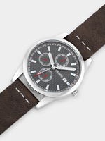 This stylish watch features a Silver Plated round case, grey multi-fashion dial with a date window and brown genuine leather strap.