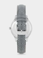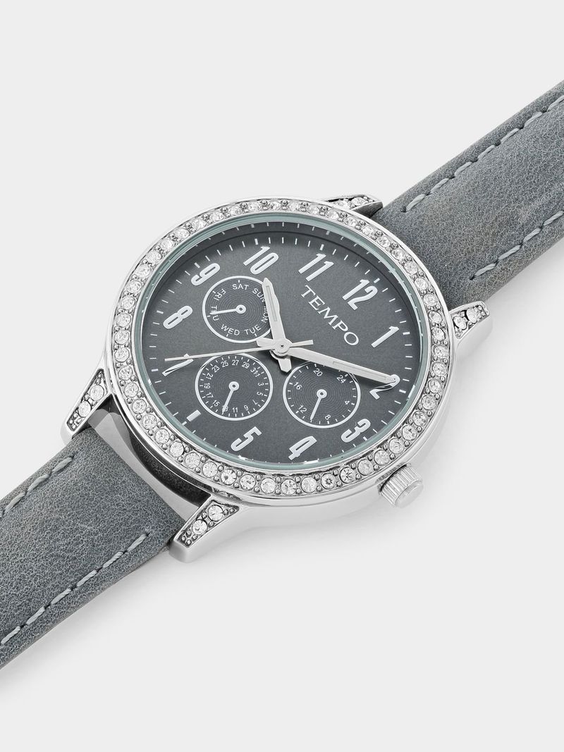This glamorous Crystal-embellished watch features a Silver Plated round case, gunmetal multi-fashion dial and grey genuine leather strap.
