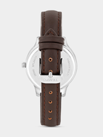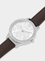 This glamorous Crystal-embellished watch features a Silver Plated round case, silver toned multi-fashion dial and brown genuine leather strap.