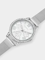 This glamorous Crystal-embellished watch features a Silver Plated round case, silver toned multi-fashion dial and Stainless Steel mesh strap.