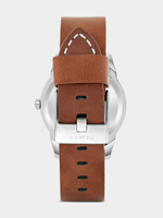 This stylish watch features a Silver Plated round case, silver toned multi-fashion dial with a date window and tan genuine leather strap.