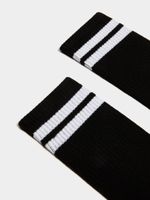 Elevate your sock game with our black socks featuring a stylish white stripe. Made from a blend of poly-cotton and polyester, these socks are comfortable and durable. Perfect for everyday wear, these socks will keep your feet happy all day long.