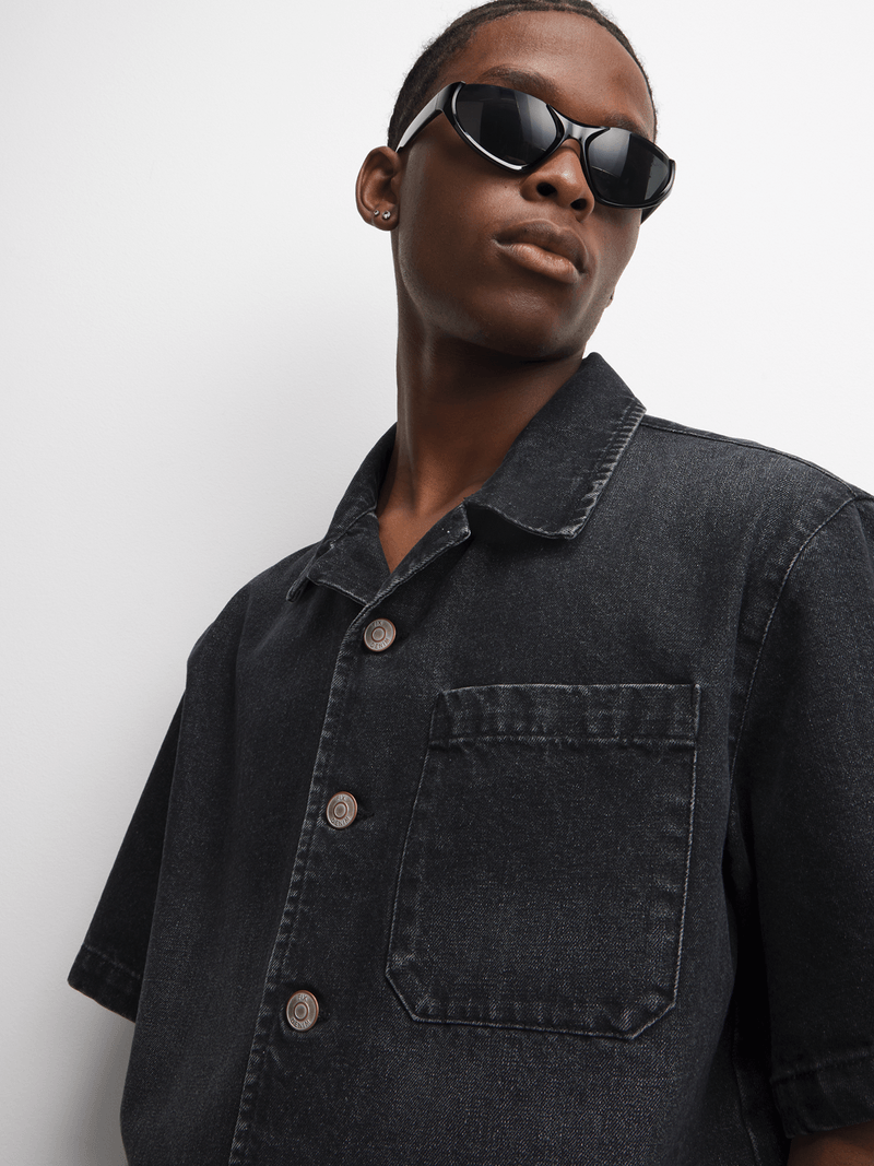 Elevate your casual look with The FIX's charcoal denim shirt. This boxy shirt is perfect for everyday wear, crafted from high-quality denim for comfort and style. It features short sleeves and a relaxed fit, this shirt is a versatile addition to any wardrobe.
