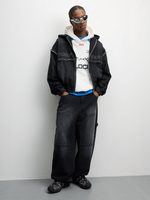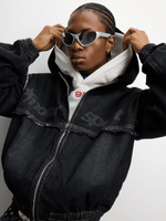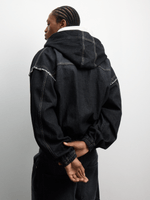Introducing The FIX Charcoal Hooded Denim Jacket! Made from high-quality denim and cotton blend, this jacket features a zip-up design for easy wear. With a stylish charcoal wash, it's perfect for any casual occasion.