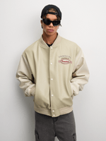 Introducing our Men's Cream Unnoficial Graphic Bomber Jacket, made from a PU fabric. Featuring dope graphic print for a unique touch. Designed for an oversized fit. Perfect for adding a stylish edge to any outfit.