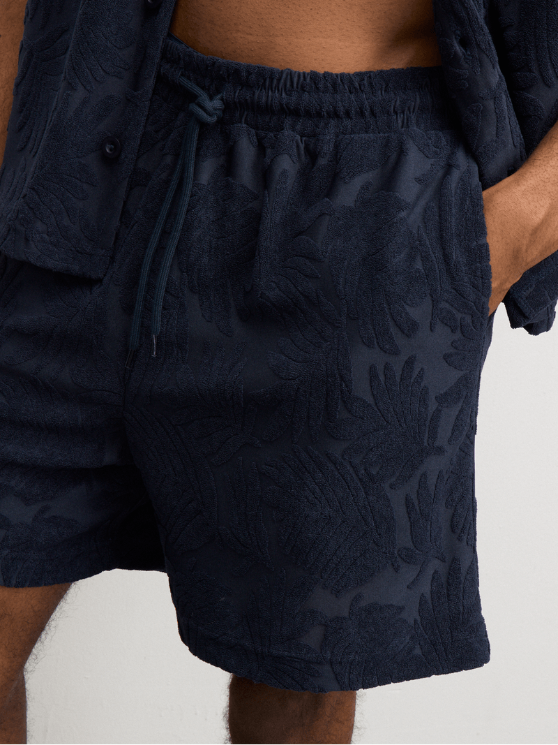 Elevate your summer style with our navy co-ord towelling palm burnout shorts. Crafted from a cozy knit fabric, these shorts offer a comfortable regular fit. Perfect for lounging or casual outings. Enjoy a true wardrobe staple.