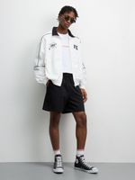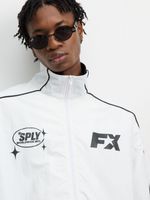 Elevate your style with our sleek white crinkle piped jacket. Made from high-quality Taslon fabric for durability. Features an oversized fit for ultimate comfort. Perfect for any occasion.