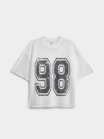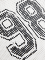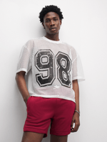 Elevate your casual look with this white graphic top. Featuring a mesh fabric, a relaxed fit perfect for all-day comfort. Embrace the oversized style and stand out in this unique and stylish piece.