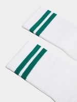 Introducing our stylish white socks with a pop of green stripe - perfect for adding a touch of flair to any outfit. Made with a blend of poly cotton and polyester for ultimate comfort and durability. These socks are sure to become your new favorite accessory.