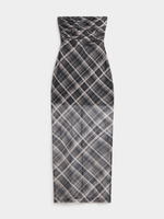 This dress is everything we are loving for the upcoming season. Featuring a black check printed mesh fabric, bandeau design & sexy side slit. Style with ya' fave pair of heels for that scorching look.