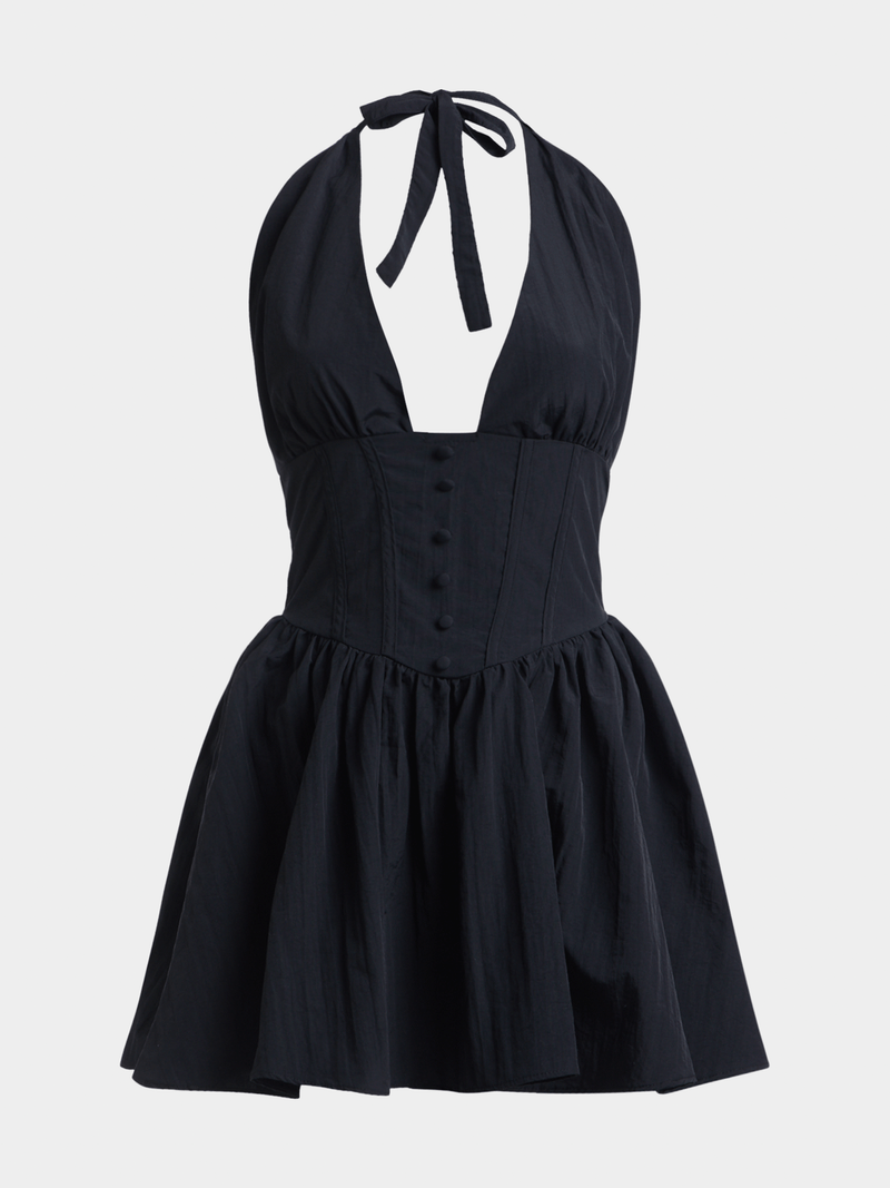 Elevate your style with our black cotton poplin mini halter dress. Featuring a halterneck design. Perfect for any occasion, this dress is a must-have in every wardrobe. Upgrade your look effortlessly with this versatile piece.