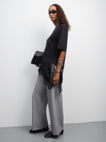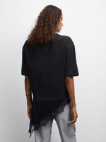 Elevate your casual style with our black cotton tee featuring elegant satin lace trim. This crew neck shirt is perfect for any occasion, with a comfortable fit and soft single jersey fabric.