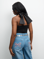 Feel effortlessly chic in our Black Crepe Knit Halter Top with a satin back tie. Designed for comfort and style, this top is a versatile addition to your wardrobe. Great for any occasion!