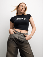 Elevate your casual style with our black baby tee. Made from a comfortable cotton blend with a hint of Lycra for stretch, this short-sleeved tee features a crew neck. Perfect for adding a touch of fun to your everyday look.