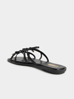 Step out in style with our women's black double bow flat sandal. Made of high-quality PU material, these sandals are perfect for any occasion. Comfortable and chic, they feature a double bow detail for a touch of elegance. Whether you're heading to the beach or a night out with friends, these sandals are a must-have addition to your wardrobe.