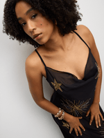 Elegant and timeless, this black georgette cowl beaded dress is a must-have for any wardrobe. The soft georgette fabric drapes beautifully. Perfect for any occasion, this dress will make you feel confident and stylish.