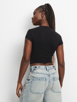 Update your casual wardrobe with The FIX's playful black baby tee, this top is lowkey lethal—servin’ skin & sass. Featuring a cotton lycra blend fabric, crop fit and a fun graphic print. Pair it with cargos, denim, or whatever’s vibin’—she goes with literally everything!