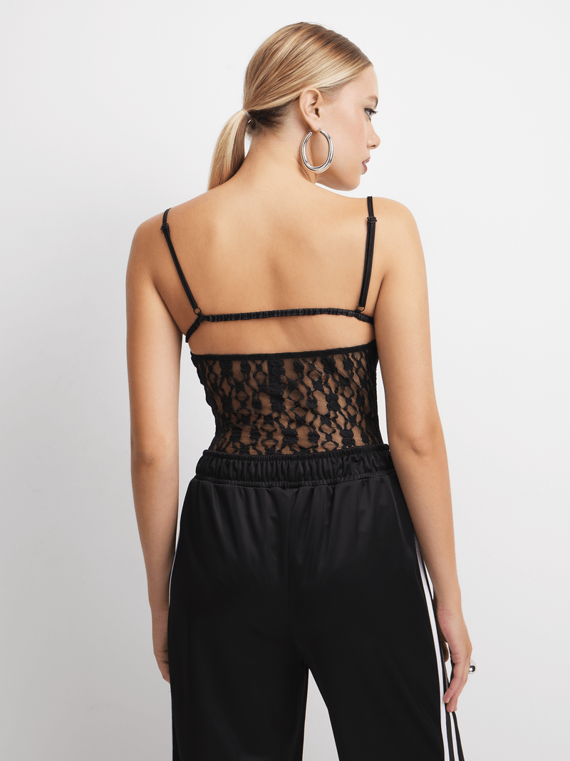 Add this must-have black bodysuit to your wardrobe because it's perfect for all occasions. Featuring a ITY fabric and lace design. Team with your favorite bottoms for a cute look.