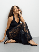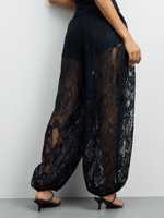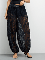 Introducing our black lace pull-on balloon pants, designed for effortless style and comfort. Made with lace fabric, Available in various sizes, they are perfect for any occasion. Elevate your wardrobe with these chic pants.