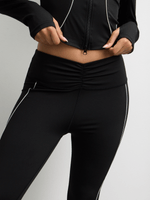 Elevate your style with our black leggings featuring chic piping and ruched detailing. Made from a comfortable polyester blend, these leggings are perfect for any occasion. Available in various sizes. Dress to impress with The FIX.